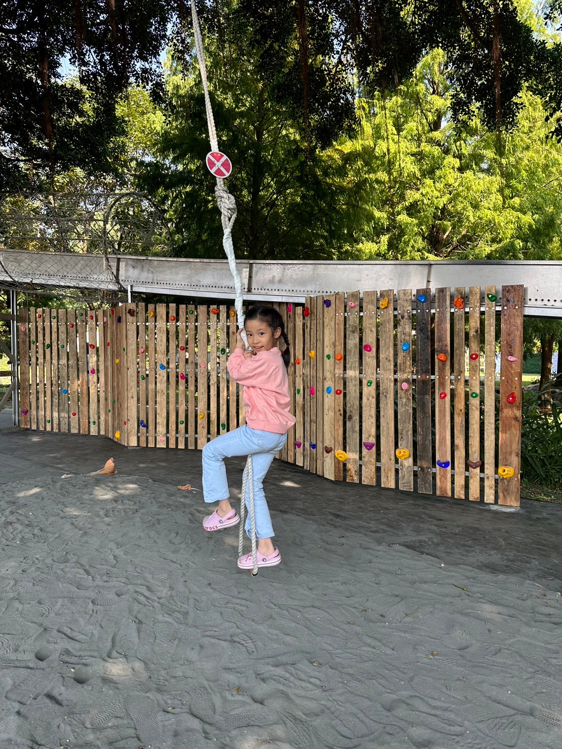 盪繩本身沒有任何危險性,只要正確使用它就可以發展出各種玩法,這項設施主要是要讓孩子連同盪繩一樣盪著盪著腦力激盪一下,在這時間父母也可以陪者孩子去互動發想,很神奇的時間喔!